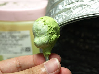 然後就直接塗上補土,作為整個頭部的基底,雖然很多書都教人從球體開始做,不過那樣我反而會花更多時間抓形狀....所以現在都是從本壘版造型開始