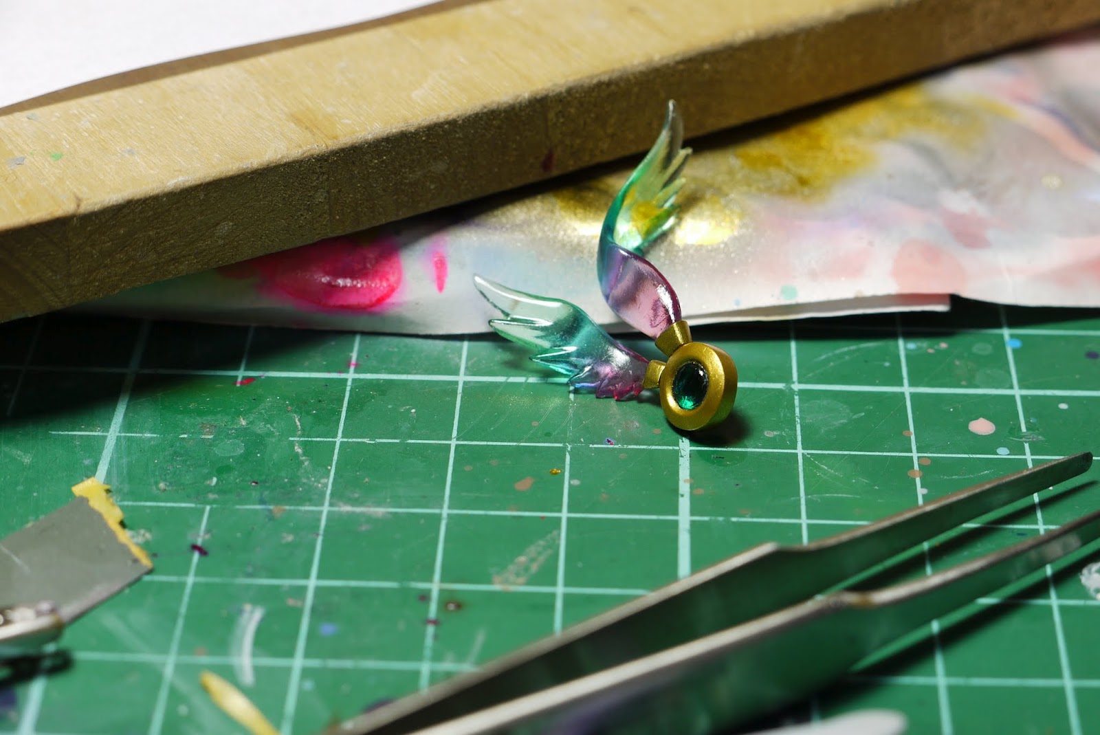 羽毛先拋光過,再依序噴上透明紅、透明藍、透明綠,感覺還蠻不錯的;寶石本來是噴透明藍,不過遮蓋後噴完金色就變成透明綠了XD
