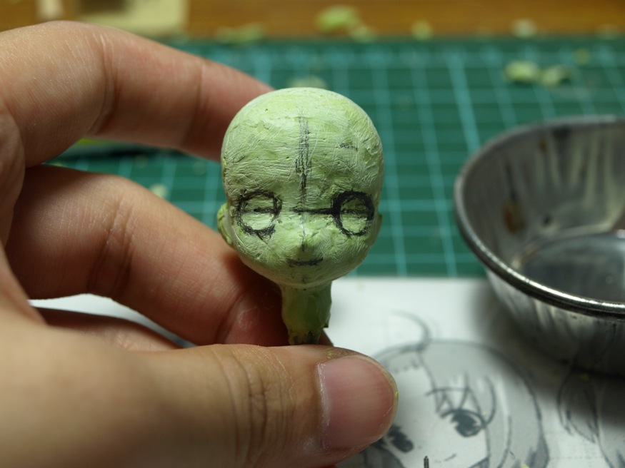 湊齊其他部分後,就開始雕刻五官,先用鉛筆再臉上畫出眼睛和嘴巴的形狀,作為雕刻的基準