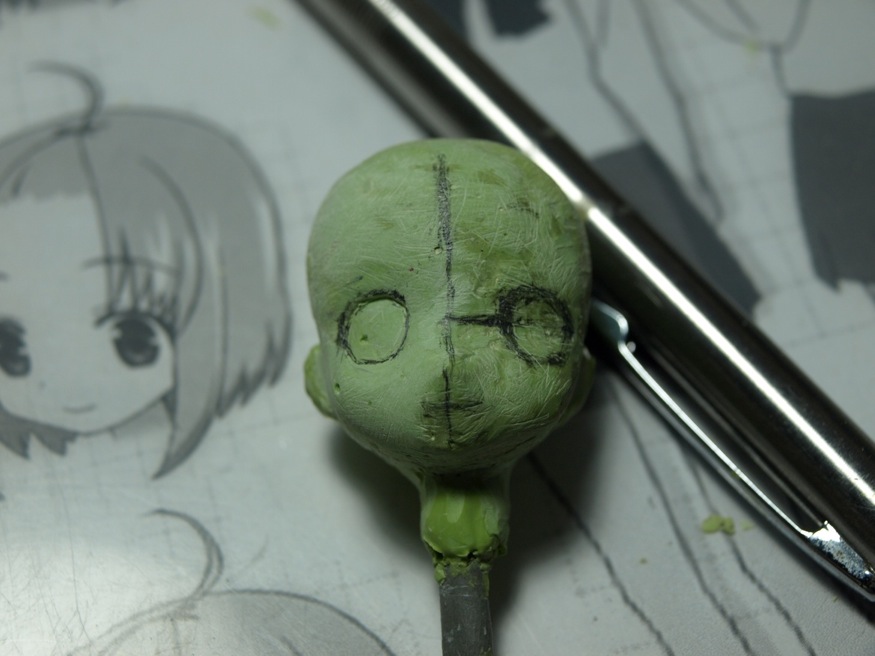 硬化後再雕一次,就變成這種感覺。看起來有像是臉了。繼續加上後腦、耳朵和脖子,一口氣做出整個頭部!