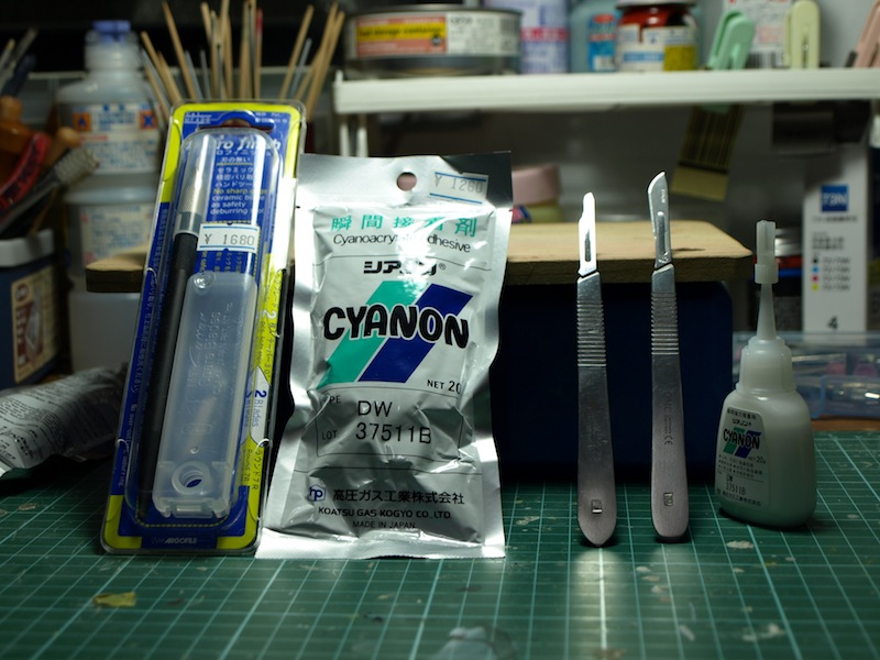 從左邊開始是陶瓷刀、白色瞬間膠CYANON、手術刀X2(最右邊那平是白色瞬間膠的內容物),除了手術刀之外,另外兩件是從日本樂天市場VOLKS代購來的。