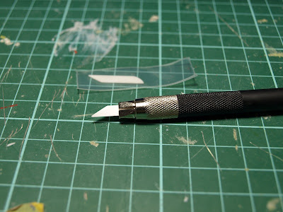 大小跟30度的筆刀刀片差不多大,前後的形狀不同,一邊是直線,另一邊是曲線,說穿了其實就是一片陶瓷板XD,主要用來刮分模線等等模型表面的瑕疵;原理是利用陶瓷板邊邊的直角來刮表面,由於陶瓷的硬度非常高,塑膠和樹脂之類的材質都可以刮的很快樂,處理後的表面也不會太粗糙,稍微用砂紙磨一磨就OK了,最大的優點在於陶瓷刀沒有刀鋒,不會割傷手或不小心傷到零件表面,使用方法就像下圖一樣,斜斜的靠在零件上再往下刮。