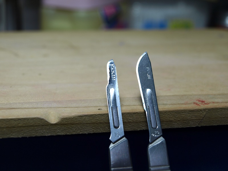最近因為之前買的手術刀片快用光了,只好到網拍來找找看(因為醫療器材行通常不會隨便賣給一般人OTL),不過有在賣的真的很少,最後終於找到一家有在賣的,又剛好在家附近,馬上衝去面交,還買到了之前沒買到的15號刀片(下圖左邊那隻),15號刀片真的很適合用來雕一些凹面造型,像是人形的臉之類的部分,比10號刀片更適合用來精細雕刻。